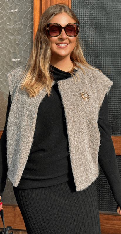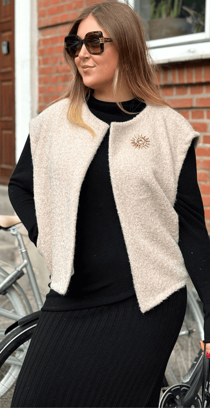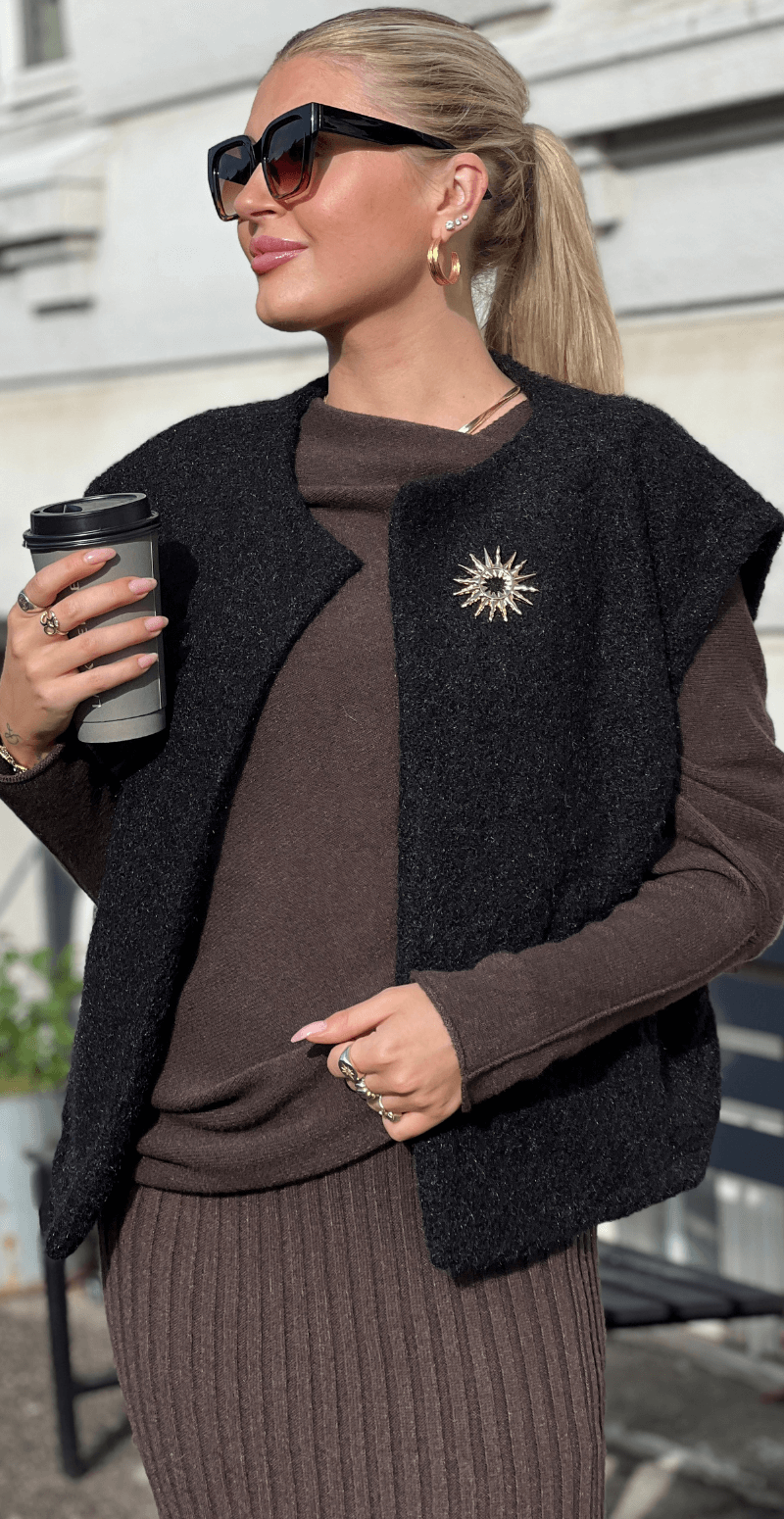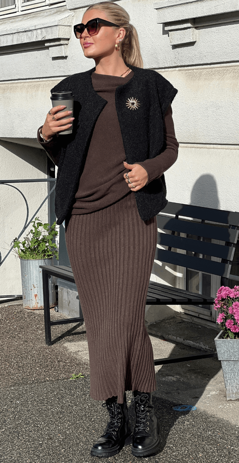 Melvine er et sofistikeret kjolesæt, der forener klassisk elegance med moderne enkelhed. Den ribstrikkede kjole smyger sig smukt om kroppen og giver en flatterende silhuet, mens den bløde vest tilføjer varme og struktur. Ideel til både hverdagsbrug og mere polerede looks.