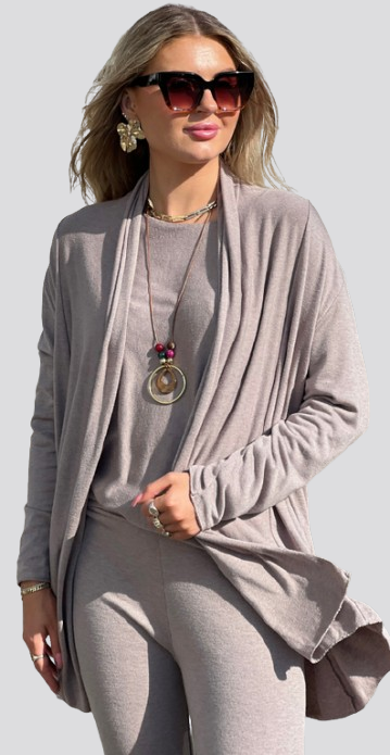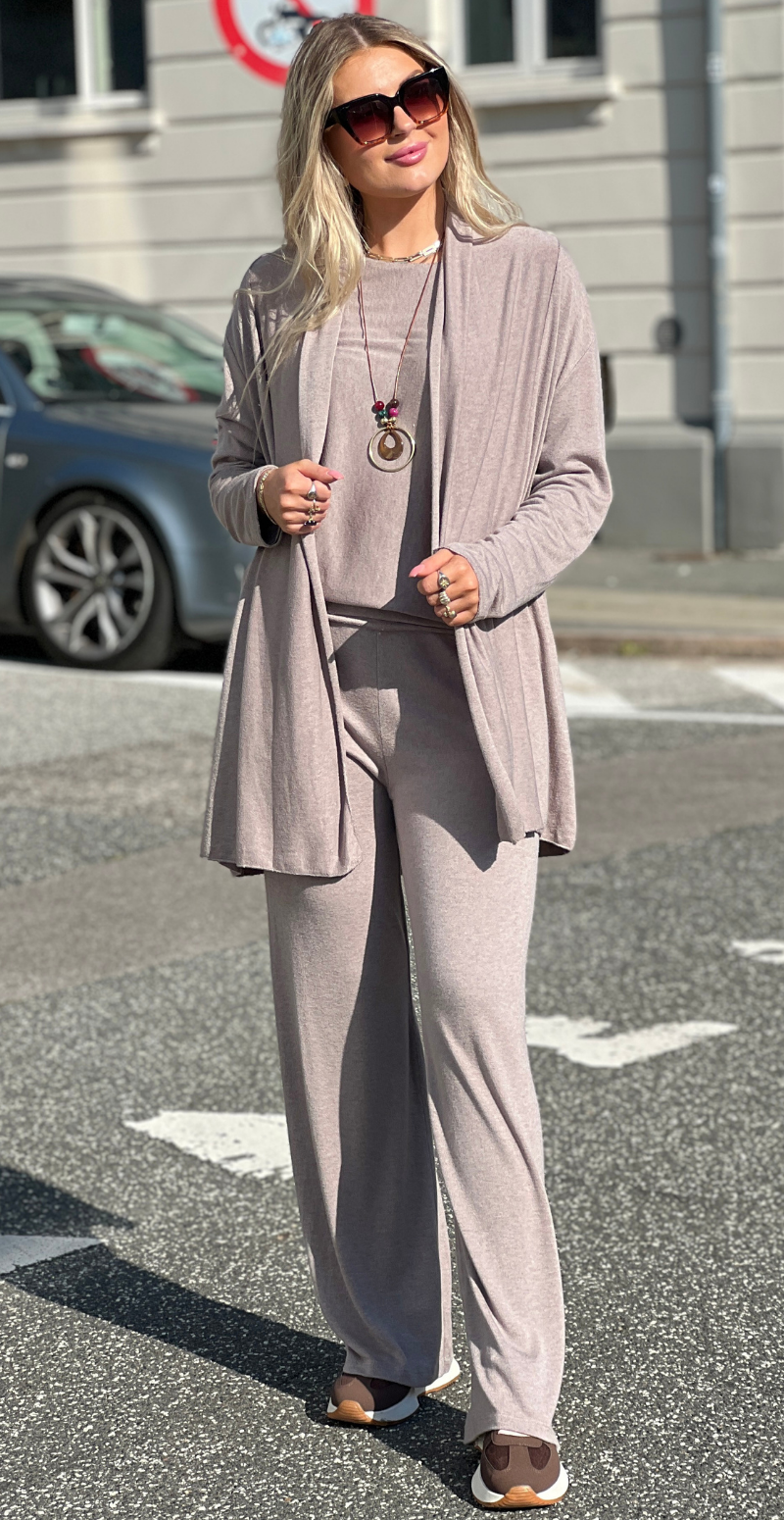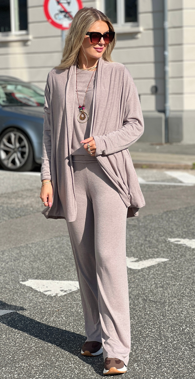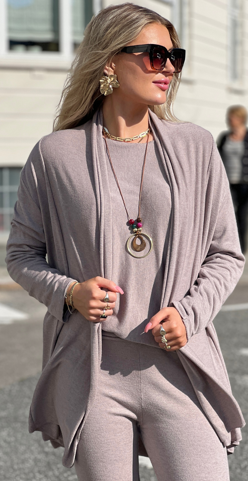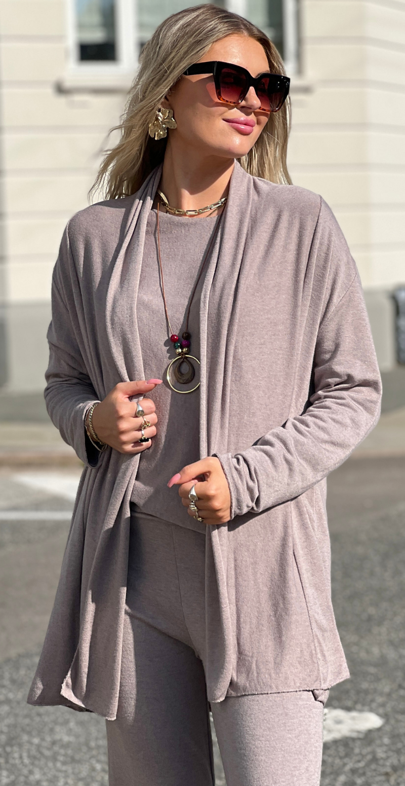 Liv er skabt til dig, der ønsker komfort uden at gå på kompromis med stil. Dette todelte lounge-sæt i blød, strækbar modalblanding føles silkeblødt mod huden og bevæger sig naturligt med kroppen. Den draperede cardigan falder let og flatterende, mens de slanke bukser giver et moderne og feminint udtryk.