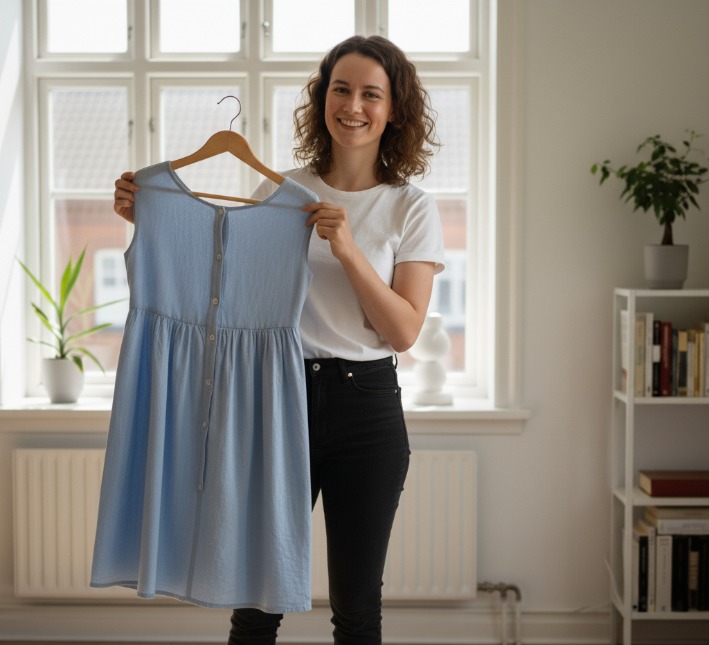Jeg er super glad for min nye blå kjole! Farven er så smuk og præcis som på billedet. Stoffet er let og virkelig behageligt at have på. Knapperne foran er en rigtig sød detalje. Den sidder perfekt og bliver helt sikkert min favorit til sommer. -