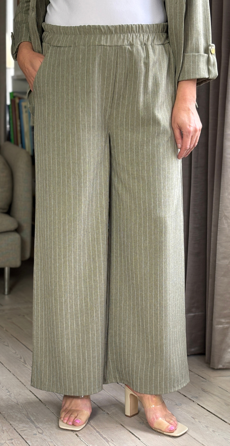 Solveig er et sofistikeret todelt sæt, der kombinerer en let oversize blazer med matchende, løstsiddende bukser. Det diskrete stribede mønster og den bløde kvalitet gør sættet ideelt til både kontoret og afslappede dage med stil.