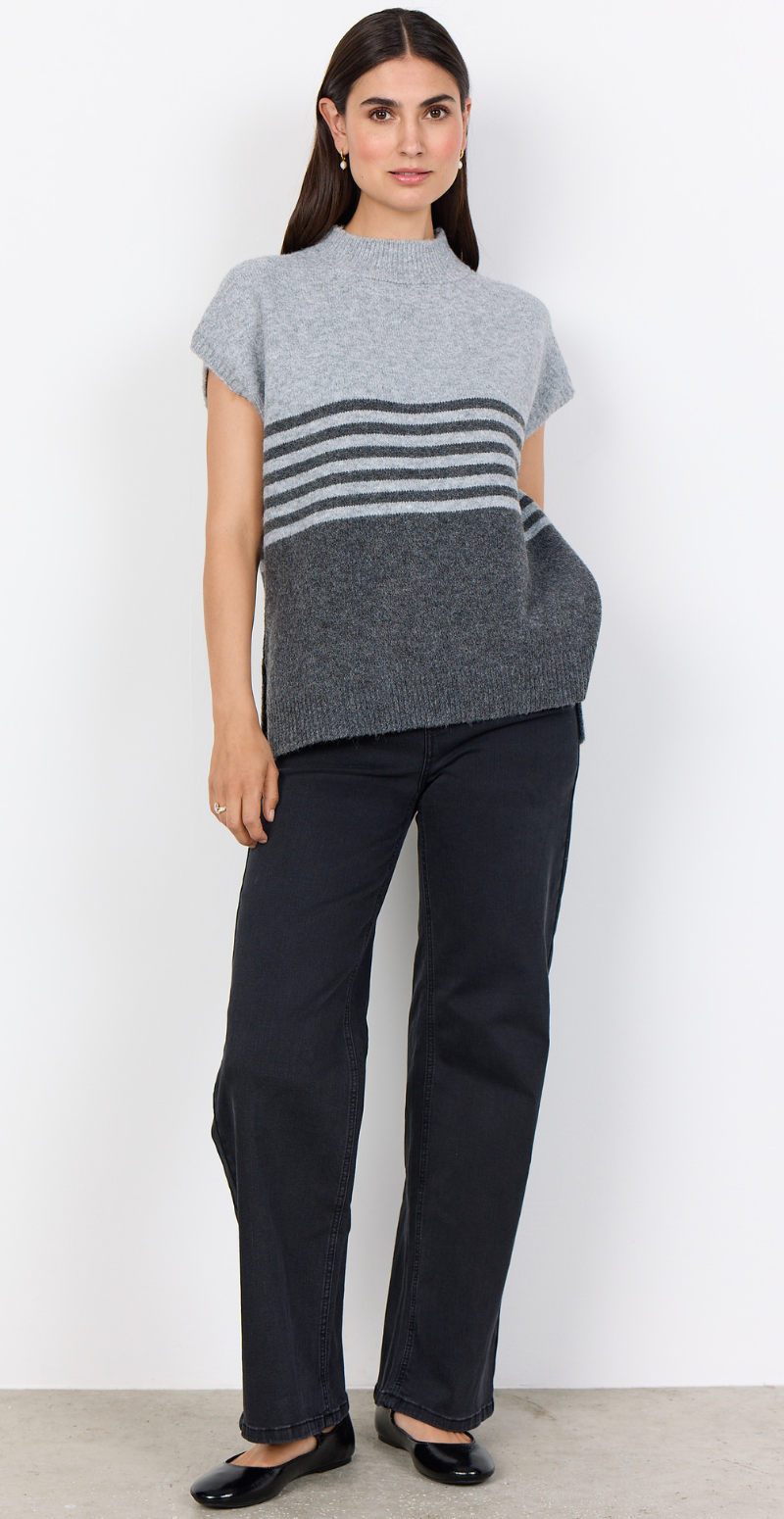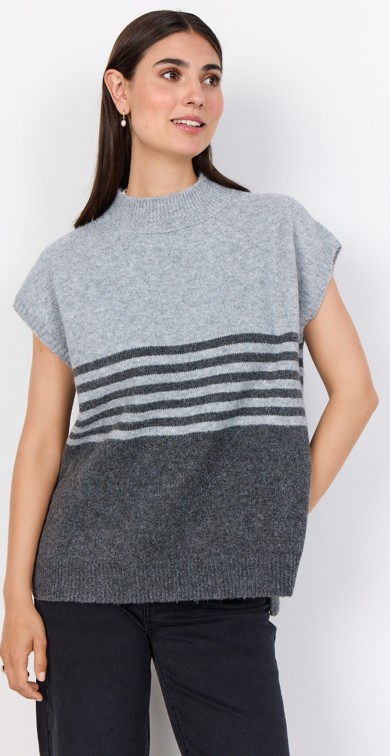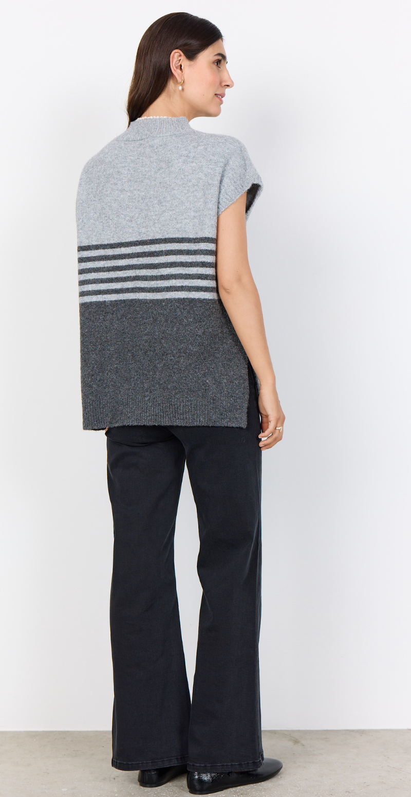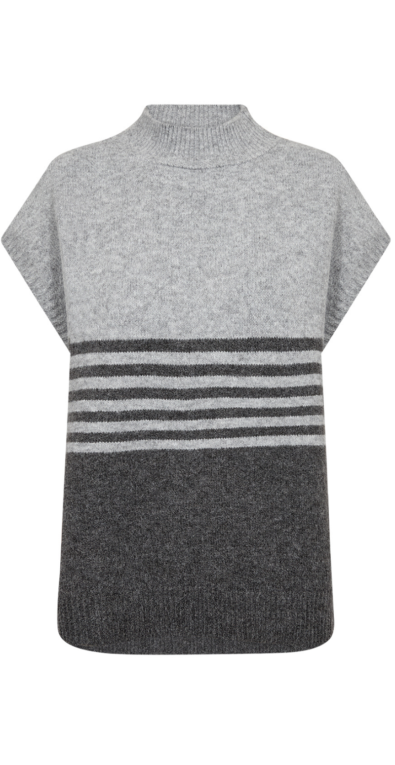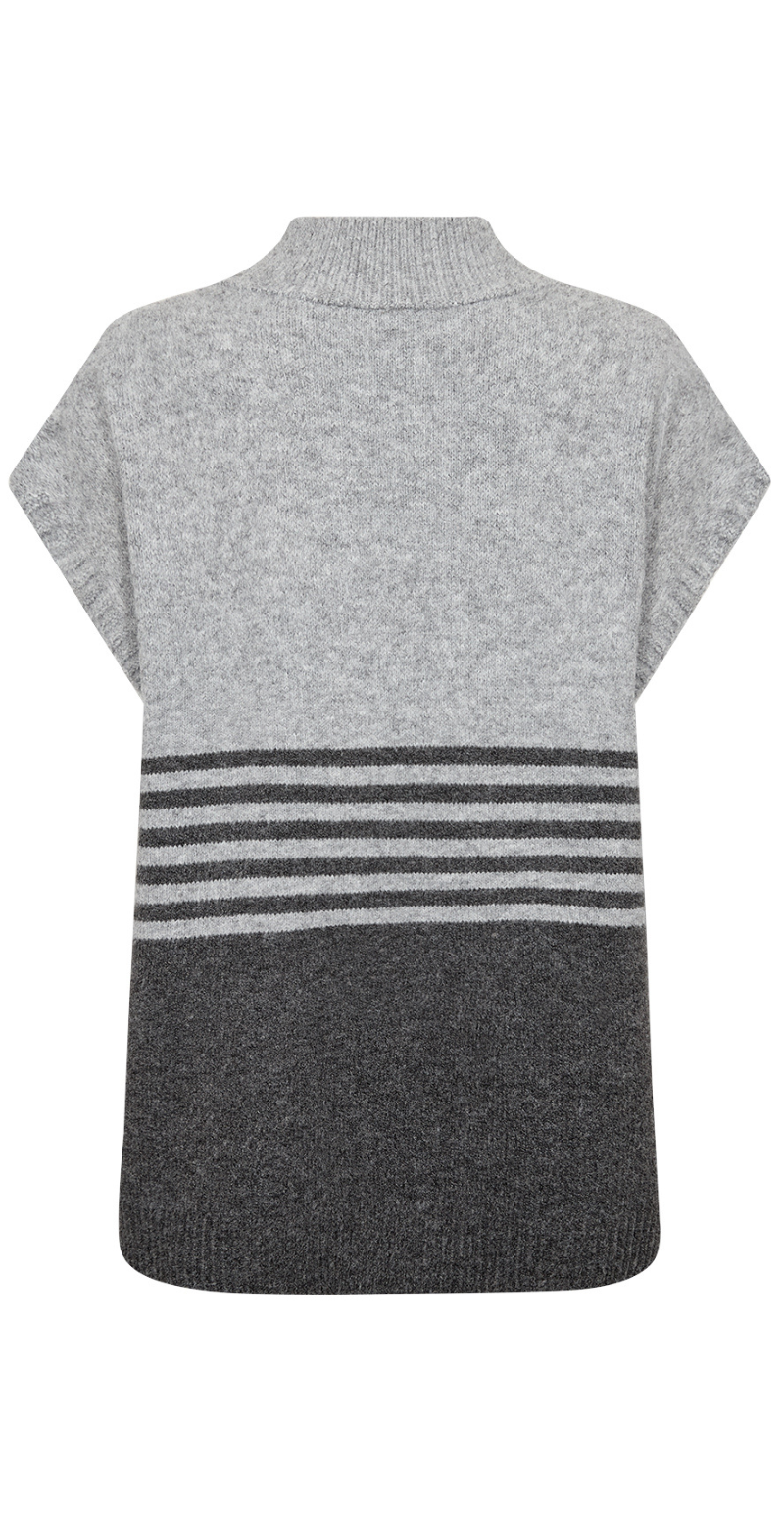 Liv er en elegant uldvest, der kombinerer enkelhed og funktionalitet. Det tofarvede grå design giver et moderne og harmonisk udtryk, mens det bløde materiale sikrer komfort hele dagen. Perfekt som et lag-på-lag stykke til både hverdag og arbejde.